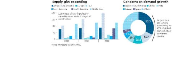 Against a capacity of 340 mmtpa, the global LNG trade in 2016 stood at 258 mmt, implying 76% utilisation. International Gas Union (IGU) estimates liquefaction capacities under construction at 115 mmtpa. Additionally, 700 mmtpa of projects have been proposed, though most of these may not see light of the day due to weak prices. Yet, if prices were to rise, some of these would be implemented, thereby keeping prices under check.