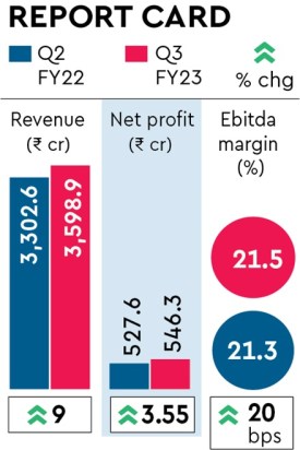 Revenue from operations stood at Rs 3,598.92 crore during October-December, up 9% as consolidated volumes improved 1% on year. Consolidated operating margin also improved 20 basis points y-o-y to 21.5% as commodity pressures abated.