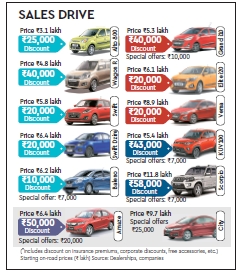 But the company isn’t leaving everything to luck. It is offering attractive discounts —on the older models—Alto, Wagon R and Celerio—discounts are being doubled from `20,000 to `40,000. Hyundai is betting big on the re-entry of its popular hatchback Santro. At its peak, the earlier Santro sold over 11,000 units/month. On other models like the Grand i10, the cash discount ranges between `40,000 to `50,000, depending on the variant. Last Diwali, dealers offered a discount of Rs 20,000 on the hatchback and this time, a Rs 40,000 discount will put the starting price at `4.9 lakh. On the Hyundai Verna, a sedan, customers can hope for a `20,000 cash discount and also Rs 30,000 worth of corporate discounts.
