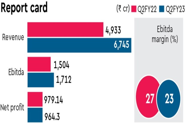 During the quarter under review, the company’s revenue rose 37% to Rs 6,745 crore, compared to Rs 4,933 crore posted in the second quarter of last fiscal. The firm also posted its high-ever quarterly Ebitda of Rs 1,712 crore, it said in a statement.