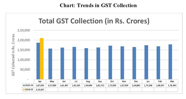 Goods & Services Tax (GST) collections have breached theRs 2 lakh crore milestone. The gross GST collection hit a record of Rs 2.10 lakh crore, an increase of 12.4% year-on-year, in April. This is as per the statement issued by the Finance Ministry.