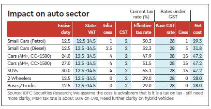 According to the new tax rate under GST, cars and SUVs with a platform size of more than 4 metres and diesel engine size of more than 1.5 litre, will fall under the tax slab of 43% compared the existing tax rate of 51.5% and 55%, respectively.