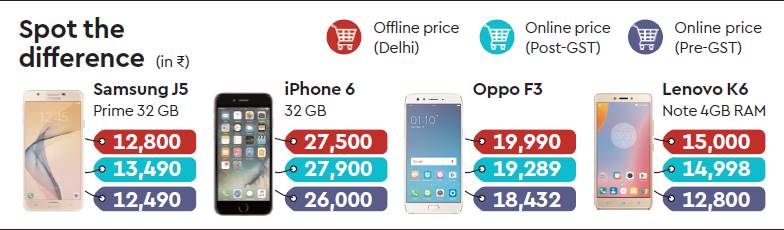 The roll-out of the goods and services tax seems to have taken a toll on sales of mobile phones by online platforms as they no more enjoy any pricing arbitrage over brick-and-mortar retail stores with the end of differential tax rates (VAT) across states. A quick check by FE showed that the price of a Samsung J5 Prime 32 GB phone in an offline retail stores currently in Delhi at Rs 12,800 is lower than the price available on Flipkart or Amazon at around Rs 13,490. However, before July the online price was around Rs 12,490. Similarly, an iPhone 6 32 GB is now available in stores for around Rs 27,500 while e-commerce portals are selling it at around Rs 27,900 against a pre-GST price of Rs 26,000.