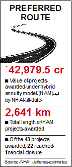 Bankers seem to be warming up to the road projects under the hybrid annuity model (HAM) with 22 projects among 43 awarded by the National Highways Authority of India (NHAI) achieving financial closure. Of the remaining, 15 projects are awaiting financial closure (soon most of these were awarded as recently as March) while one project has been cancelled. FE could not ascertain the details of five more projects. HAM has been the preferred mode by NHAI for awarding road projects, with 54% of the projects being awarded under this model in FY17.