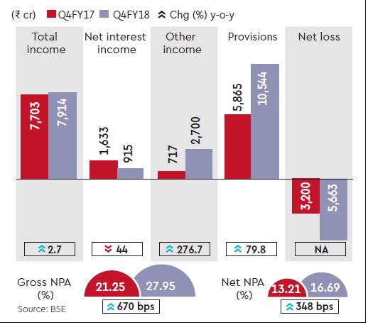 IDBI Bank on Friday reported a net loss of Rs 5,662.76 crore during the January-March quarter, wider than the Rs 3,199.8 crore loss reported in the same period last year, owing to an 80% year-on-year (y-o-y) jump in provisions. The bank also reported its highest ever gross non-performing asset (NPA) ratio at 27.95%, up 323 basis points (bps) sequentially. Provisions for NPAs stood at Rs 10,773.3 crore in the March quarter, 78% higher than what it had reported in Q4FY17. The net NPA ratio rose 67 bps sequentially to 16.69%.