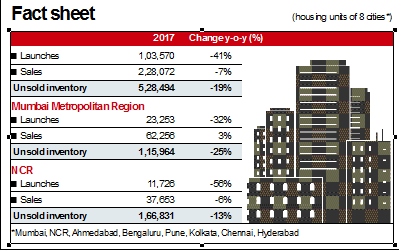 New home launches in 2017 fell by 41% to 1,03,570 units from 1,75,822 units a year ago, according to the eighth edition of Knight Frank’s flagship half-yearly report.  Homes launches in 2017 plummeted by a staggering 78% from the peak of 2010. The volume of new projects entering the market in the second half of 2017 stood at 40,832 units, close to one-fourth of the supply levels in 2015, the report said.  “2017 was been packed with uncertainty, volatility and long-term promise of new opportunities. While a battery of reforms tested industry stakeholders, the new paradigm of transparency and consolidation achieved in the process should pave the way for healthy momentum in near future. Until the end of 2017, India’s residential sector had shrunk to a fraction of its size in less than a decade…Nevertheless, the near standstill triggered by demonetisation seems to have tapered with time.