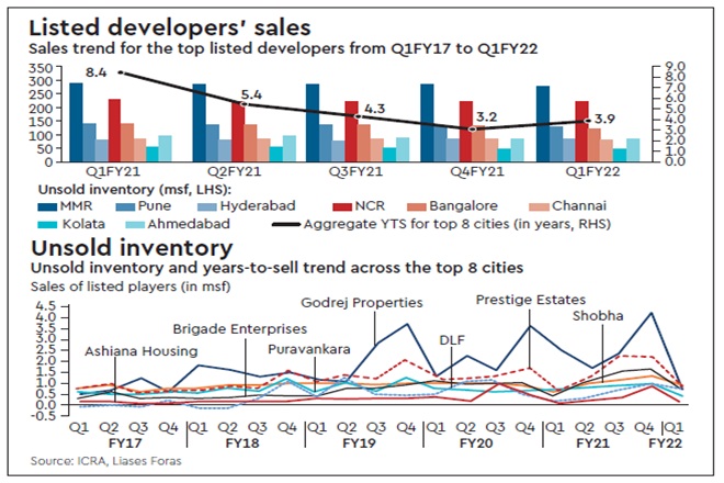 Icra said housing sales across the top eight cities fell 19% q-o-q to 68.5 million sq ft (MSF) in Q1 FY2022 due to the second wave of Covid-19 infections. The sequential drop comes on a high base of Q4 FY2021 (87.4 MSF), the second-highest sales since FY2012. However, residential sales more than doubled when compared to 33.7 MSF sales recorded in Q1 FY2021.