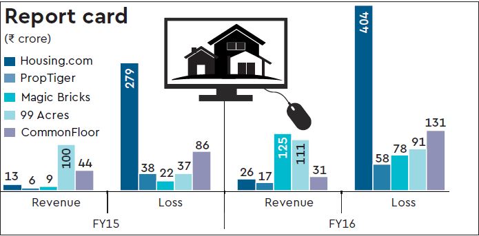 Internet-based real estate companies including Housing.com, PropTiger, MagicBricks, 99acres and CommonFloor collectively reported losses of Rs762 crore for the year ended March 31, 2016. The losses of the companies jumped nearly 65% from Rs462 crore in FY15. However revenues of these companies increased to Rs311 crore from Rs173 crore in 2014-15. The growth in revenues notwithstanding, the consistent losses on the books of these companies might foster consolidation in the space, say industry experts.