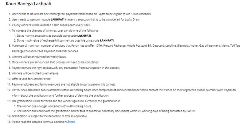 • User needs to use promocode LAKHPATI in every transaction that is to be considered for Lucky Draw