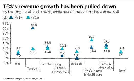 Banking recovery – the centre of the discussion storm TCS’s growth has been pulled down by the banking, hi-tech and retail sectors while other sectors have done well. The CFO believes that slower banking growth is not linked to TCS’s high market or wallet share at some of the large US banks. Rather, banks are simply cautious to increase spending at this stage – although, with regulatory pressure expected to lessen and a continued pick-up in business, spending should grow in the coming quarters. TCS is strong in digital spend and has not lost market share. Top banks in the US report decent revenue growth and, if this recovery is sustained, management expects IT spend to pick up as well.