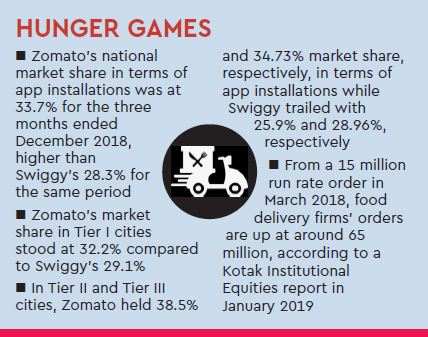 However, Zomato’s national market share in terms of app installations was at 33.7% for the three months ended December 2018, higher than Swiggy’s 28.3% for the same period. Zomato’s market share in Tier I cities stood at 32.2% compared to Swiggy’s 29.1%. In Tier II and Tier III cities, Zomato held 38.5% and 34.73% market share, respectively, in terms of app installations while Swiggy trailed with 25.9% and 28.96%, respectively.