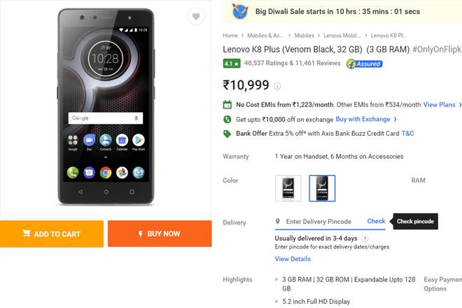 3. Lenovo K8 Plus: A direct competition of Redmi 4, Lenovo K8 Plus is priced at Rs 10,999 on Flipkart. By returning your old phone, a discount of upto Rs 10,000 can be availed by the customers. Then, there is the extra 5% off with Axis Bank Buzz Credit Card which further brings down the price.