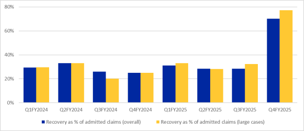 The record recovery in Q4FY25, ICRA said, was led by a few large cases (admitted claims > Rs 1,000 crore) where 77 per cent recovery was achieved against the admitted claims. These large cases had approximately 90 per cent share in recovery but only 10 per cent share in approved resolution plans.