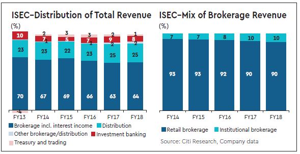 Leading retail broking franchise: ISEC has built a strong retail broking franchise on the back of its ICICI Direct platform and is a market leader with 10% market share in broking by number of clients (as of Mar-18) and 9% share in trading volumes (ex-proprietary). It is leveraging its base of 4.1 m customers to cross-sell mutual funds and insurance, and the share of this business has risen from 23% to 25% of revenue over FY13 to FY18, though market share is still low (~4% in MF commissions in FY18).