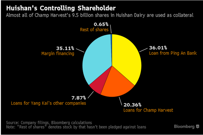 Huishan detailed Yang’s exposure in a statement after the crash. Champ Harvest Ltd., an entity controlled by Yang and part-owned by Ge, holds almost 71 percent of the milk producer’s shares, with nearly all of them used as collateral for margin debt, loans to Champ Harvest and financing for Yang’s other companies, Huishan said. Champ Harvest also took an equity stake in Jilin Jiutai Rural Commercial Bank Corp., Huishan’s second-largest bank creditor.