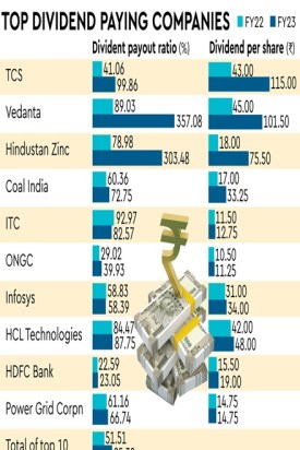 The dividend per share recommended by the top three companies was more than double of last year’s, with TCS again topping the charts. The IT company recommended a dividend of Rs 115 per share for FY23, compared with Rs 43 per share in FY22. Vedanta recommended Rs 101.50 per share (against Rs 45), and HZL Rs 75.50 per share (up from Rs 18).