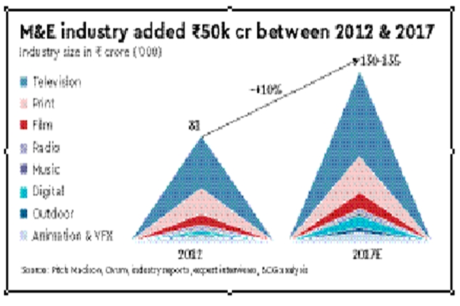 The size of Indian media and entertainment industry, which grew at a rate of 10% over the last five years between 2012 and 2017 adding over `50,000 crore of revenue, stood in the range of `1,30,000-1,35,000 crore in 2017, according to a report called ‘Media and Entertainment: The Nucleus of India’s Creative Economy’, compiled by industry body CII and Boston Consulting Group (BCG).