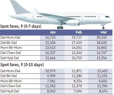 Analysts said spot fares have risen as IndiGo started cancelling around 30 flights daily since February due to shortage of pilots, which will carry on this month and the Jet fleet got depleted with several groundings due to non-payment to lessors.