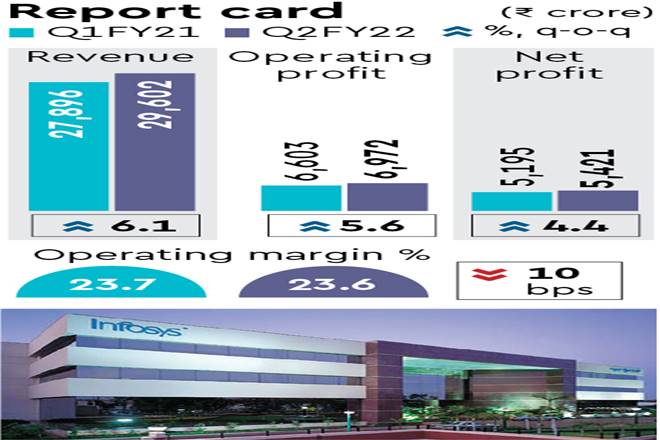 Infosys posted a net profit of Rs 5,421 crore, up 4.3% on a sequential basis. Bloomberg consensus estimate had pegged the net profit at Rs 5,288 crore. Revenues at Rs 29,602 crore was up 6.1% compared to the preceding quarter. Bloomberg estimate was of Rs 29,365 crore.