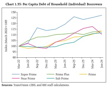 But there’s more. Household debt increase is primarily being driven by increase in total number of borrowers who accounted for more than half of the increase. Only about one-third of the increase is on account of the higher indebtedness of the same set of people, or increase in per capita debt, with the remaining classified as ‘interaction effect’. Increasing number of people getting access to formal credit implies higher financialization and, if accompanied by declining share of loan from informal sources, could mean success of government’s various programme of financial inclusion. Further, the increase in per capita debt is primarily driven by super-prime borrowers. As per the report, per capita debt for the super-prime category has increased by about 25% between March’22 and June’24 whereas the increase has been in the range of 7-10% for other groups. This is a positive trend since almost 70% of loan being taken by the super-prime borrowers is going for asset creation such as housing or vehicle loan or productive purposes such as agriculture loans, business loans and education loans, which would add to the productive capacity of the economy. “From a debt-servicing capacity perspective, the rise in per capita debt only among highly rated borrowers and use of debt for asset creation are credit positive and financial stability enhancing,” the report says. India’s debt service ratio has been in the range of 6.5-7.0% over the years, among the lowest in the world.