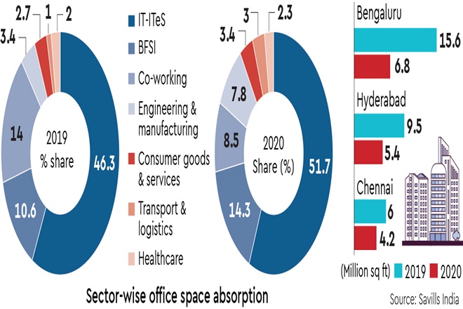 The IT sector continued to rule the Indian office space absorption in 2020 with the service centric cities — Bengaluru, Hyderabad and Chennai — alone accounting for almost 60% of the total 27.4 million sq ft (MSF) of space leased by corporates.