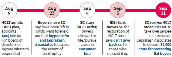 In a relief to IDBI Bank and others in the consortium of lenders to Jaypee Infratech, the Supreme Court on Monday not only restored the insolvency resolution proceedings against the real estate developer that were stayed on September 4 but also expedited it. However, while modifying its previous order, the court continued to lend a helping hand to the firm’s 32,000 flat buyers, by directing the National Company Law Tribunal (NCLT)-appointed interim resolution professional (IRP) to take over the “records and management” of the company and submit an interim resolution within 45 days (against 270 days granted by the Insolvency and Bankruptcy Code of India (IBC), 2016), which shall include the interests of “low- and middle-income home buyers”.
