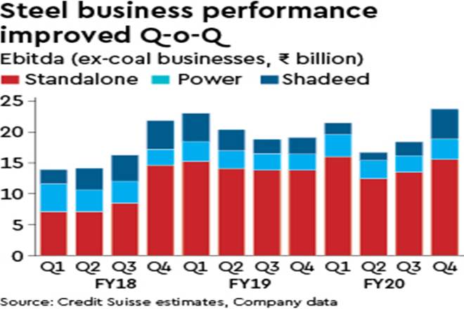 JSPL’s Q4 Ebitda beat CSe (+8%), driven by its steel businesses. JSPL performed better than expected while global mining operations remained a drag. Below Ebitda, depreciation was lower due to adjustments in its Australian mining subsidiary. Beat in standalone was largely driven by lower costs, likely due to usage of SMPL ore.
