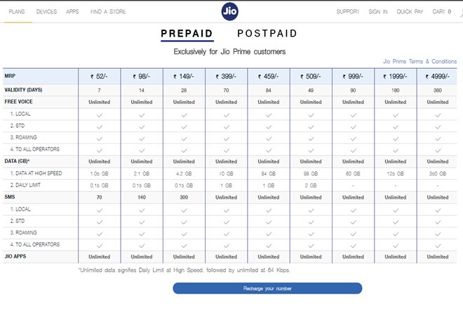 Reliance Jio came up with new plans on the day of Diwali while revising the rates of its already existing prepaid and postpaid plans. These new rates are effective from October 19. Among the plans that were revised, was the Rs 399 plan. Earlier Jio was giving 1GB data per day and unlimited calling under this plan for 84 days but now, Jio offers same benefits for just 70 days. The revision of prices was confirmed by the telecom operator when it announced 100 percent cashback offer on the Rs 399 recharge plan 10 days ago. Apart from this, the post-FUP speed for both prepaid and postpaid packs has been curtailed from 128kbps to 64kbps. Here is the complete list of Jio prepaid and postpaid plans, as per the official website:
