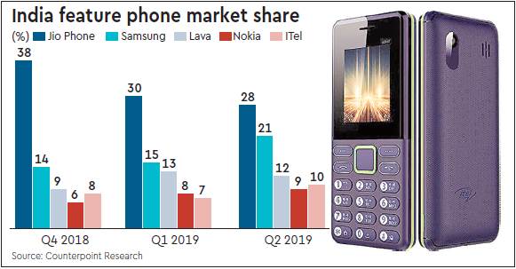 Jain told FE, “With Jio Phone’s entry, feature phone demand went up 70-80%, but now this is softening. They have a huge inventory build up, which they have not been able to clear. Due to slowing demand for Jio Phone, players such as Samsung, Lava and iTel were able to capture share in sub-Rs 1,000 segment during the April-June quarter.” Jio’s loss was gain for competition. Its closest rival Samsung, helped by aggressive marketing and sales push, increased its feature phone market share to 21% during Q2 2019. The Korean electronics major controlled 15% share during