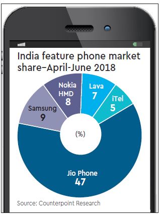 Reliance Jio’s cheap 4G feature phone JioPhone accounted for almost half of the country’s overall feature phone shipments during April-June 2018, according to Counterpoint Research. JioPhone’s shipments during the quarter stood at 47% of the overall domestic feature phone shipments, Counterpoint data showed.