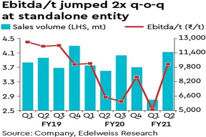 Going ahead, we expect standalone Ebitda to sustain at Rs 11,500/t on average through H2FY21 due to: (i) negotiation of half yearly contracts at 10–12% higher prices; (ii) low coking coal prices; and (iii) improved domestic demand. That said, we expect an improvement at overseas subsidiaries only by Q1FY22e.