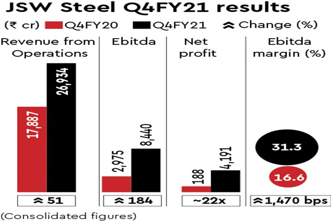 JSW Steel reported a sharp jump in the consolidated net profit of nearly 22 times on a year-on-year basis to Rs 4,191 crore for the quarter ended March 31, 2021, clocking its highest quarterly profit ever.