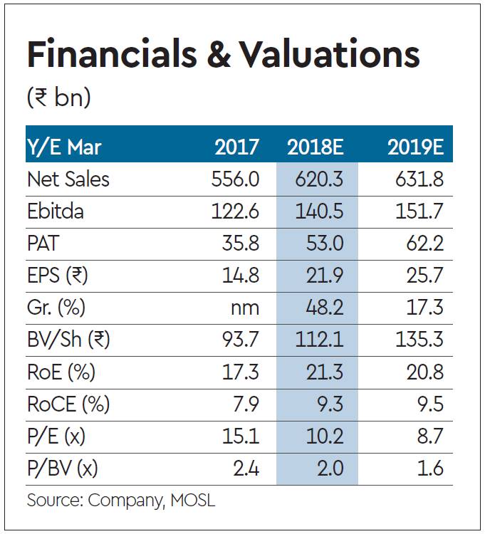 Margin outlook positive; subsidiaries driving upgrade: Global steel market and prices are trading strong, driven by positive surprise in demand from China. Indian steel demand too is inching up. We expect margins to expand for JSTL on declining input cost and stronger steel prices. We are upgrading cons. FY19e Ebitda by 4% to Rs 152 bn on significant improvement in the operating performance of subsidiaries. The SOTP too is increased by 5% to Rs 297/share. Maintain Buy.