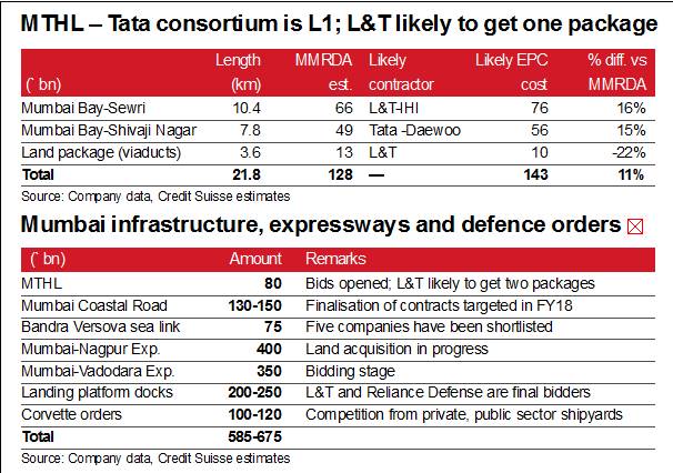 Stay Outperform on domestic execution pick-up, steady Middle East, potential gains from divestment, strong cash flows with efficiency in working capital, reasonable valuation at 19x P/E and 12X EV/Ebitda on FY19E consolidated EPC business. Key risk is margin erosion on delays while absence of cycle can cap upside. Visibility improves on Mumbai trans-harbour opportunity. L&T (in JV with Japanese company IHI Corporation) has emerged as the likely winner for two of three packages of the MTHL project (85% JICA funded), with potential order inflow of Rs 70 bn. The awarding could take some time as bids are higher than the government’s estimate. While the Tata consortium is L1 for both main packages, each consortium can get only one package, giving L&T a chance to get one package as an L2 bidder. The concept of least difference may mean that L&T can get a larger package as its difference (vs. L1 bid) is smaller in that one.