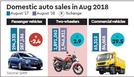 SIAM had earlier projected that the commercial vehicle segment could grow around 10-12% this fiscal. However, in the April-August period, the segment grew by 41.67% to 3,91,260 units against 2,76,182 units in the year-ago period. Meanwhile, in August domestic passenger vehicle sales declined for the second month in succession with a 2.46% drop compared to the same month a year earlier. Car sales declined 1.03% to 1,96,847 units.