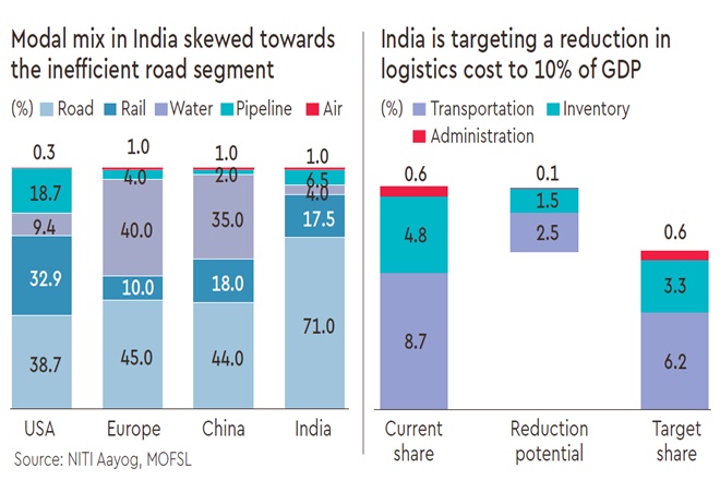 If logistics costs are broken down, ~30% is due to inventory (warehousing as well as in-transit inventory) and the balance on account of transportation. With the steps that have been taken, the Union government is looking to reduce logistics costs to ~10% of GDP, with an almost equal reduction in transport and inventory costs.