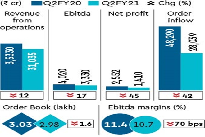 The company’s revenues were impacted by the pandemic. Revenue from operations declined 12% y-o-y to Rs 31,035 crore. International revenue during the quarter at Rs 12,148 crore constituted 39% of the total revenue. The operating profit for the second quarter ended September 30 was down 17% y-o-y to Rs 3,330 crore, while the operating margins declined 70 basis points to 10.7%. Raman said ebitda (earnings before interest, tax, depreciation, amortisation) is a combination of job mix and volume.