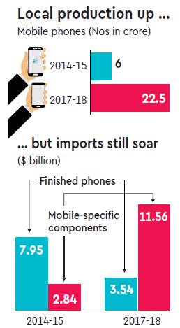 According to NPE 2019, the production of mobile handsets rose from 60 million in 2014-15 to 225 million in 2017-18; and these units provided employment to 6.7 lakh persons directly and indirectly (see graphic). Fairly low levels of value addition, however, have meant that while imports of complete phones have fallen from $8bn in FY15 to $3.5bn in FY18, imports of mobile-specific components rose from $2.8bn to $11.6bn; imports of components seem to have fallen in FY19, but that is due to the import classification of some items changing.