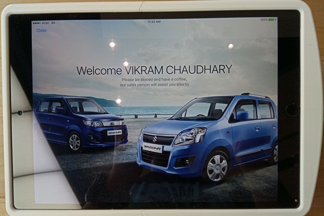 As I enter my details, the car I like, my interests, etc, the screen—it has images of Maruti vehicles, in blue—reads: “Welcome, Vikram Chaudhary. Please be seated and have a coffee. Our sales person will assist you shortly.”