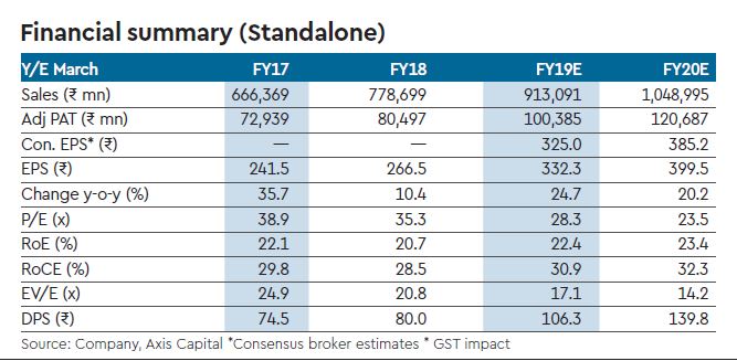 Volume growth outlook: Management has maintained double-digit volume growth outlook for FY19, which would remain above industry growth (possibly 8-9%). Rural demand continues to remain buoyant, witnessing 15% growth driven by consecutive normal monsoons and MSP increase.