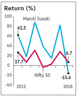 While the stock of Maruti Suzuki rose at a compound annual growth rate (CAGR) of 45.5% between 2013-17, the Nifty50 gained 12.3% during the same period. In fact, when the benchmark yielded a negative return of 4.06 in 2015, Maruti Suzuki rose 38.8%.