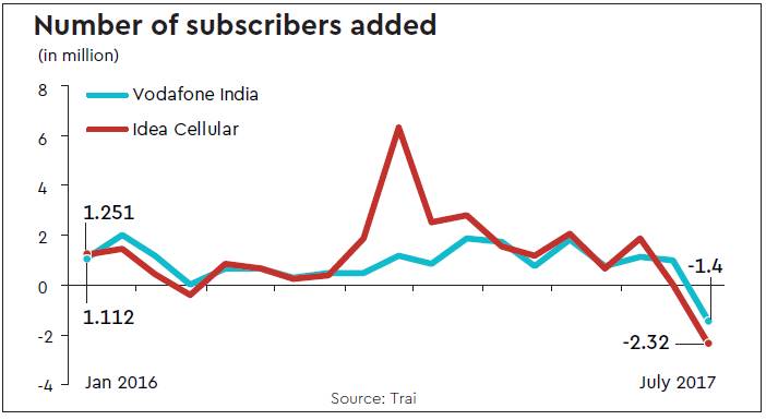 Even as Bharti Airtel and state-run BSNL managed to counter Reliance Jio by adding subscribers during July, the story for the country’s second and third largest telecom operators — Vodafone India and Idea Cellular — was the opposite, with both losing subscribers during the month, a first for them in over a year. While Vodafone lost 1.4 million subscribers in July, the drop for Idea was much steeper at 2.32 million during the month, the latest data from Trai showed. For Vodafone, July was the first month when the operator lost subscribers since January 2016. In fact, on an average during the April-June 2017 period, it had added almost a million subscribers every month. Its subscriber market share came down from 17.86% during June 2017 to 17.74% in July.
