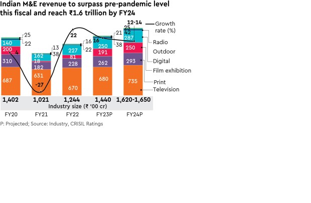 The Indian media and entertainment (M&E) sector is expected to post revenue growth of 12-14% year-on-year to approximately `1.6 trillion in FY24, against around 16% growth expected this fiscal, according to a report by Crisil Ratings. The revenue growth from advertising would be led by digital platforms, followed by TV and print, the report added.