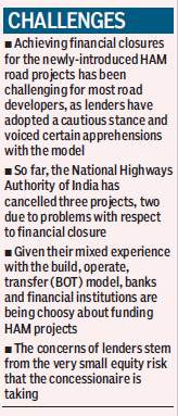 Achieving financial closures for the newly-introduced HAM road projects has been challenging for most road developers, as lenders have adopted a cautious stance and voiced certain apprehensions with the model. So far, the National Highways Authority of India (NHAI) has cancelled three projects, two due to problems with respect to financial closure.