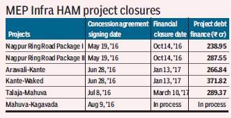 Mumbai-based MEP Infrastructure has completed the financial closures for five out of six hybrid annuity model (HAM) projects that it won last year. The financial closure for the sixth project, the 40-km Mahua-Kagadavar stretch under the National Highways Development Project (NHDP) Phase IV, in Gujarat, is expected to be announced by Friday, March 17.