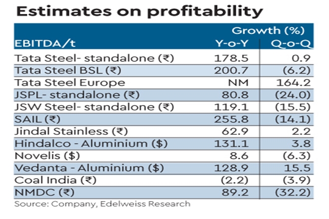 Focus companies: Unlike the previous three quarters, we expect companies’ performance to vary. We expect the following companies to stand out: (i) Tata Steel’s Ebitda at record Rs 198 bn; (ii) SAIL’s Ebitda likely at Rs 72 bn; (iii) JSL to record Ebitda of Rs 6.2 bn. However, we expect NMDC’s Ebitda to dip 36% q-o-q.
