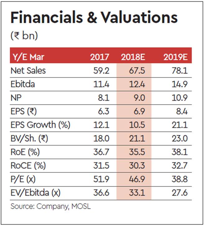 HDPE (a key ingredient in packaging material) price was down 4% y-o-y. Gross margin contraction can be ascribed to delay in price increases because of GST implementation. Consol. A&P expenses declined 230bp y-o-y and 22.9% on absolute basis y-o-y. There was a decrease in other expenditure by 40bp y-o-y, while staff costs increased 50bp y-o-y. EBITDA margin contracted 210bp y-o-y (lower than est. of – 300bp) to 19.3%, and thus, EBITDA fell 13.3% y-o-y (est. of -14.2%) to Rs 3.24 billion. Adj.