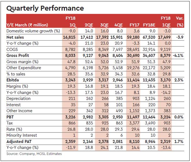 HDPE (a key ingredient in packaging material) price was down 4% y-o-y. Gross margin contraction can be ascribed to delay in price increases because of GST implementation. Consol. A&P expenses declined 230bp y-o-y and 22.9% on absolute basis y-o-y. There was a decrease in other expenditure by 40bp y-o-y, while staff costs increased 50bp y-o-y. EBITDA margin contracted 210bp y-o-y (lower than est. of – 300bp) to 19.3%, and thus, EBITDA fell 13.3% y-o-y (est. of -14.2%) to Rs 3.24 billion. Adj.