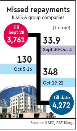 IL&FS, on Tuesday, said it has defaulted on Rs 348 crore of debt that was due in three separate repayments on October 19, 20 and 22, taking the total amount in missed repayments till date to Rs 4,272 crore. Prior to this latest default, IL&FS had defaulted on principal and interest on loans from banks, inter-corporate deposits and commercial papers totalling Rs 3,761 crore till September 28 and a further Rs 33.9 crore between September 30 and October 4. (According to exchange filings, it defaulted on another Rs 130 crore between October 5 and October 16).