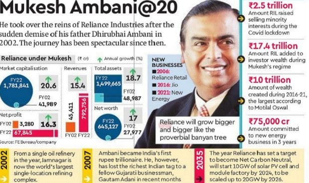 Business tycoon Mukesh Ambani completed 20 years at the helm of Reliance Industries Ltd this week, growing the homegrown giant 42 times bigger in the market cap than that when he took over. Mukesh Ambani took over the reins of RIL after the demise of his father Dhirubhai Ambani in the year 2002. Under his leadership, Reliance diversified into a consumer business giant from being an energy and textiles behemoth earlier, with Mukesh Ambani’s retail and telecom ventures. His latest foray into renewable energy is equally ambitious, with an outlay of Rs 75,000 crore.